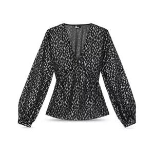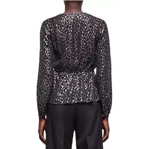 This stunning The Kooples blouse features a metallic leopard-print finish that shimmers beautifully, perfect for adding a chic edge to day-to-night looks. Designed with a flattering V-neckline and long sleeves, it offers a feminine, slightly relaxed silhouette that pairs effortlessly with denim or tailored trousers.