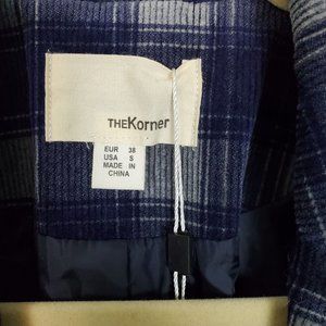 NWT The Korner Blue Plaid Corduroy Blazer Jacket, size Small. Features 2 functional front pockets and 2 button closure. Fully lined. Material is 97% Cotton/3% Elastane. Dry clean only. Great with jeans, pants or a pencil skirt.