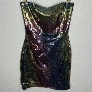 sequin-embellished mini dress from NEW ARRIVALS featuring sequin design, fitted waistline, draped detailing, rear zip fastening, above-knee length, strapless and green/blue/pink.