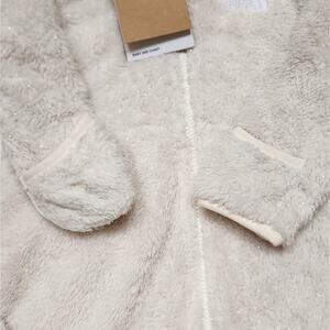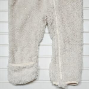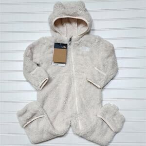 NWT The North Face Baby Campshire One Piece, size 12-18 Months, color is called White Dune/Sparkle, attached, three-piece hood with self fabric bear ears, full-zip and zips open completely for easy on/off, fold-over mitts at sleeve cuffs and booties at bottom hem, embroidered logo on left chest.
