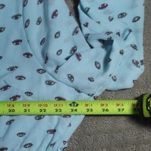 All Eyes are on you with this really cute "eye" patterned blouse by The Pattern. It is new with tags; however, it does have some "bleach" damage to the liner - See the last picture. The damage cannot be seen when wearing. It is on the inside of the blouse. Otherwise, the blouse is in excellent/new condition.