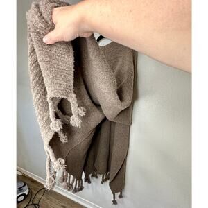 Long Fawn Mocha poncho from The Row brand, Follain model (sold out) with wavy texture in merino wool (51%) and curly cashmere (23%). It is extraordinarily light and cozy! Hand-braided fringed edges.