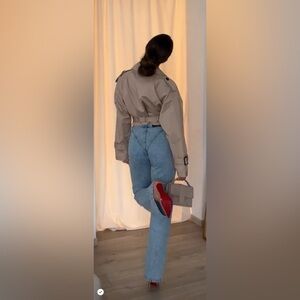 High waist jeans with belt loops. Pronounced seam detail. Front metal zip closure.