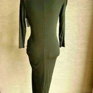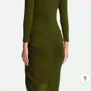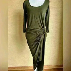 NWT! The Vanity Room Ruched Asymmetrical Dress in a size M. Stretchy material. Bodycon dress. Round neckline. Material 96% rayon and 4% spandex.