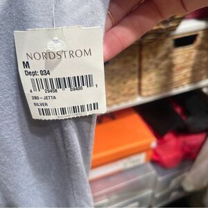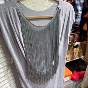 NWT dress from eco-friendly clothing company The Battalion. Women’s size medium. Silver grey color, form fitting, cap sleeve, open draped back with fringe. 100% bamboo.