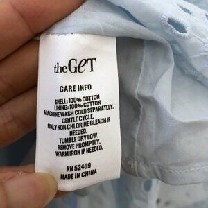 NWT TheGet Solid Light Blue Eyelet Short Sleeves Tiered with Pockets Midi Dress. Size Medium.