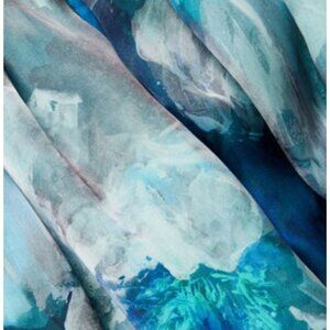 NWT, no flaws, size 0. A-line teal and floral midi dress with a plunging V-neckline and cap sleeves, featuring a fitted bodice and a flowing, layered skirt with a watercolor-style floral print in shades of blue, green, and black.