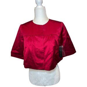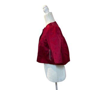 This cropped jacket offers a polished, sophisticated look with its rich crimson hue and luxurious silk blend. Ideal for formal or semi-formal settings.