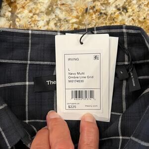 NEW WITH TAGS - RETAIL $225 - SIZE LARGE - This Theory Men's Navy Irving Multi Standard-Fit Shirt in Ombré Grid Cotton i sperfect for any outing. Point collar - Button-front closure - Side slits at the hem - Cut from a cotton fabric with an ombré grid pattern. COLOR is NAVY PLAID, Standard fit, long sleeves. 100% Cotton