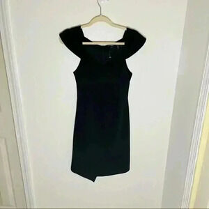 Description: Off the shoulder; back zip; lined; cap sleeves. Bodycon styling. Faux wrap semi asymmetrical skirt.