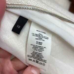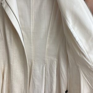 Never worn- slight discoloration on the right side/back area- pictured- would probably come out when dry cleaned. Not really noticeable.