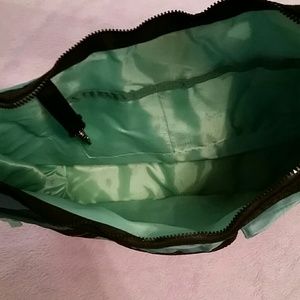 brand new in bag never used only taken out for pictures. Numerous compartments both inside and out see second picture for various ways to use the bag. so many uses like.. A purse, diaper bag, or even small over night bag! 1st pic reflects color best, it is a teal/blue