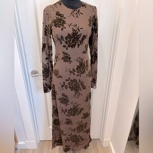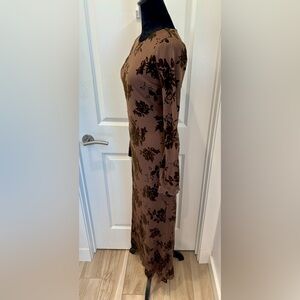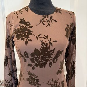 This elegant floral long sleeve dress features a beautiful brown hue with intricate velvety floral patterns. Perfect for any occasion, it combines style and comfort effortlessly. Lined for modesty except for the arms, with a back cutout to show some skin, this offers something for the gal who is both modest and flirtatious and seeks to surprise. Lovely.