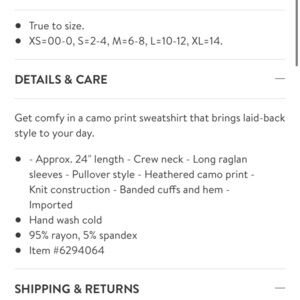 Approx. 24" length - Crew neck - Long raglan sleeves - Pullover style - Heathered camo print - Knit construction - Banded cuffs and hem - Imported
