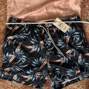 Brand new with tags. This 2-pack from Threadbare includes one pair in a bold coral with contrast waistband and one in a vibrant tropical palm print. Mid-thigh length, lightweight, quick-dry material—ideal for pool days, beach trips, or warm-weather vacations.