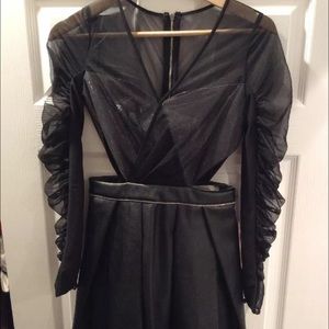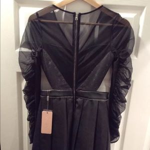 Perfect evening dress sporting a silver metallic mesh sweetheart bodice beneath a sheer black mesh wrap front. The dress features ruched sleeves and a faux leather flared box pleated skirt.