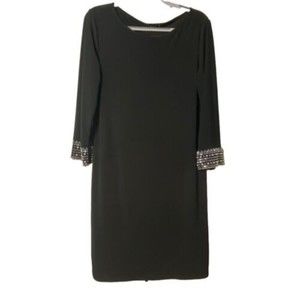 Elevate your wardrobe with the NWT Tiana B. Black Knit Dress in a women's size M. This dress effortlessly combines comfort and style, featuring long sleeves with exquisite beaded cuffs that add a touch of elegance to your look. Product Details: