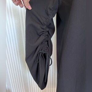 Features crew neck, long sleeves with ruched drawstring detail, hidden back zipper closure, shift silhouette, and knee-length.