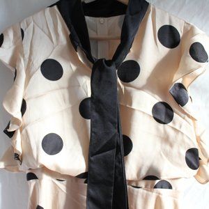 A dress suitable from A.M. to P.M., any day of the week. Tie collar design, silky material, ruffle sleeve. Casual or formal wear.