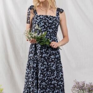 Gorgeous black dress with blue floral print! Perfect dress for this spring and summer! Pack on your next vacation or plan to wear on your next beach day! Flattering square neckline, sleeveless, adjustable tie straps, floral, midi length, smocked back, lined. Beautiful fabric, soft and well done!