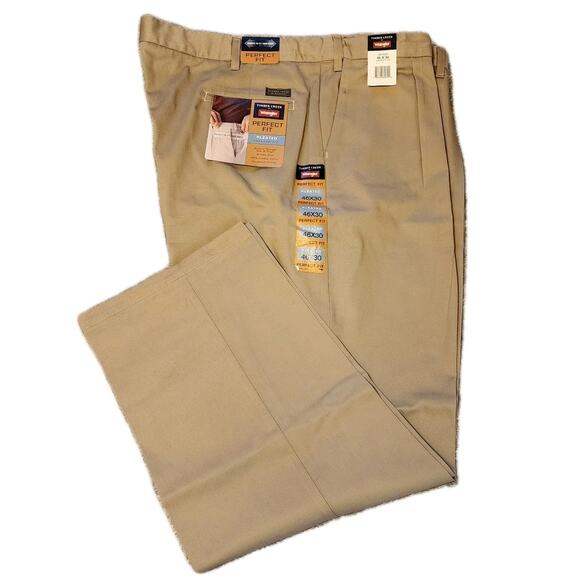 New with tags. Men's size 46x30 Khaki by Timber Creek for Wrangler. Pleated front and adjustable waist for comfort.