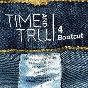 NWT Time And Tru women’s TT blue bootcut jeans has four and a half pockets. Great stretch and also has slits at the bottom (pic above). Size 4. 68% Cotton 21% Polyester 9% Rayon 2% Spandex Waist: 14 inches Length: 41 inches