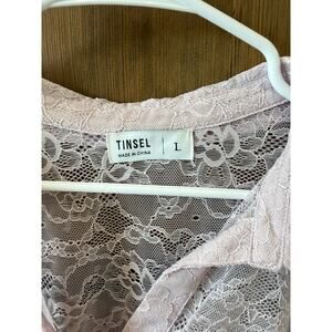 Add a touch of boho chic to your wardrobe with this stunning NWT Tinsel women's blouse! This beautiful pink lace top features sheer long sleeves and a button-down front, perfect for layering or wearing on its own.