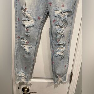 NWT Tinseltown Size 5 Pizza Embroidered Distressed Curvy Hi Rise Skinny Jeans