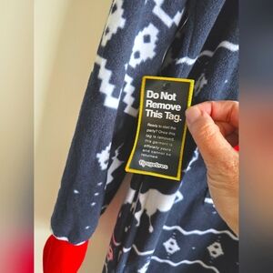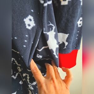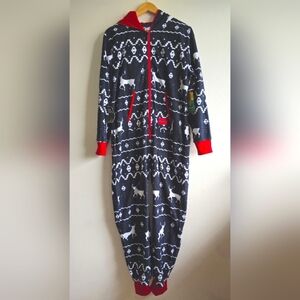 comfortable regardless of where you are or what you are doing during the holiday! The bold blue background features a white Fair Isle design complete with grazing reindeer for good measure. The front pockets include a zipper for security purposes and the Christmas jumpsuit features a holiday red accent color.