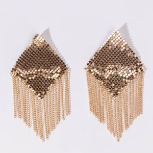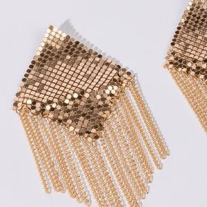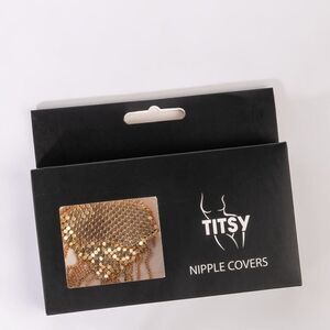 The TITSY Gold Mesh Nipple Covers feature a diamond-shaped faux gold metal disc base with chain fringe and single-use adhesive backing.
