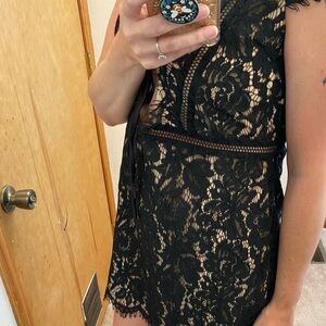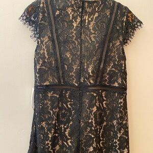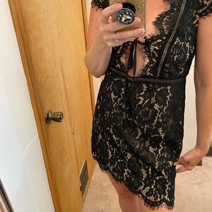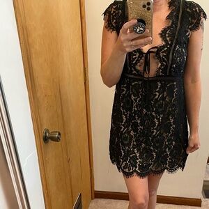 NWT. Black lace dress with nude underlay, very For Love and Lemons inspired style. Tie front and pull on style. No stretch. Open tie front is sexy but not too revealing. Great length and perfect sexy feminine dress. (M)