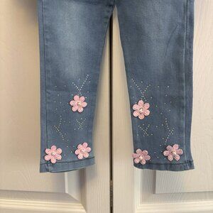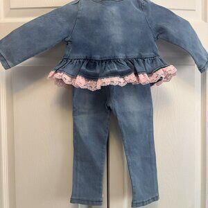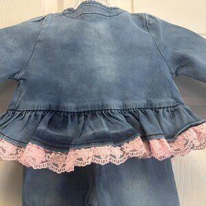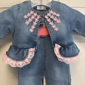 Sweet matching toddler girl denim jacket and pants set size 1-2 years. The jacket has a 1 button closure at the top and features three rows of pink flowers surrounded by multicolor tiny gems. The button ends in a ruffle with pink lace trim. The jacket length is 11.5 in and the sleeves measure 12 in.
