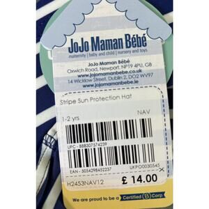 New with tags navy and white striped sun protection hat from JoJo Maman Bébé, fits toddlers 1-2 years. UPF 50+, made with recycled plastics, and is lightweight and quick drying. Features brim and neck covering.