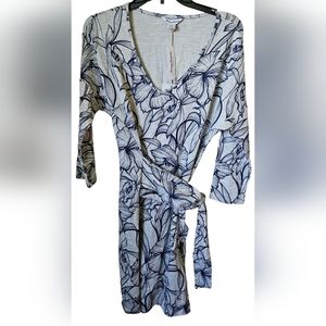 NWT This is an adorable dress with a side tie, deep V-neck, 3/4 sleeve, knee-length, and a large floral pattern in blue and Heather gray.