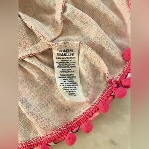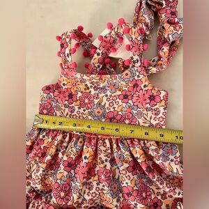 Adorable pink floral toddler dress with pom pom details on straps and hem