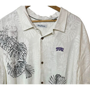 New with tags Tommy Bahama TCU Branded Camp shirt. Button Down . Silk Washable. Classic FIt. Embroidered Leaves. Size 3XL