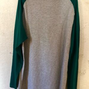 Stylish long sleeve shirt by Tommy Hilfiger. Features a classic gray body with green sleeves. Ideal for casual outings.