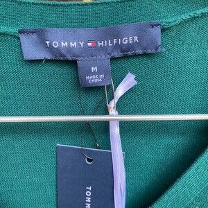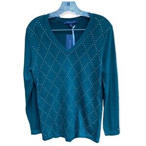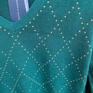 NWT. Tommy Hilfiger Women Single Studded Argyle Sweater Flag Logo Green M.
