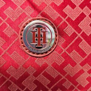 This Tommy Hilfiger bucket bag is a stylish accessory for any occasion. The deep rich red color with an iridescent finish and silver hardware color is a great combination for any outfit. The bag has a top handle and a drawstring closure, with a medium size measuring 10 inches in width, 5-1/2 inches in depth, and 11 inches in height. The bag is made of polyester and features a lined interior with pockets for storage. The Tommy Hilfiger monogram pattern adds a touch of designer and nautical theme to the bag. This bucket bag is a great addition to any collection and is perfect for business, casual, cocktail party, or a night on the town.