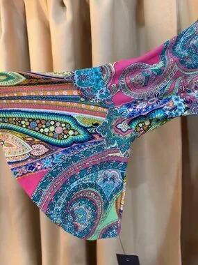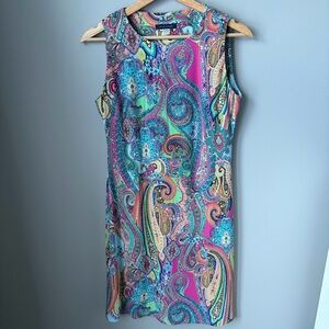 Bright and eye-catching Tommy Hilfiger paisley print dress in a flattering shift silhouette. Features a vibrant mix of blues, pinks, and greens with intricate paisley detailing. Lightweight and comfortable with 3/4 sleeves—perfect for work, brunch, or vacation wear.