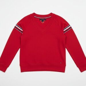 Sporty and chic, this brand-new Tommy Hilfiger sweatshirt combines comfort with a touch of metallic shine. Features a flattering v-neckline, long sleeves with red/white/blue + metallic silver stripe detail, and a relaxed fit. Perfect for casual wear or layering with denim and sneakers.