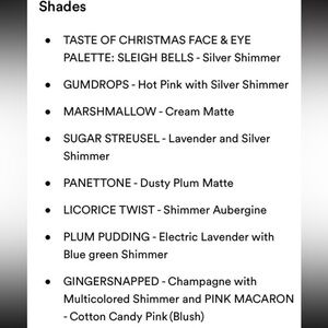 This Set Contains: 3 x 0.13 oz/ 3.68 g Palettes in Taste of Christmas Face & Eye Palette, Peacock Face & Eye Palette, Holiday Angel Face & Eye Palette. Retails for $105