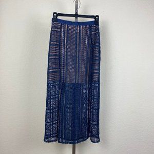 Navy lace midi skirt with two splits at front and nude lining. 100% Polyester