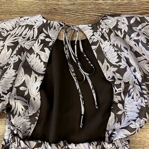 •	Features: Puff sleeves, ruffle hem, open back with tie