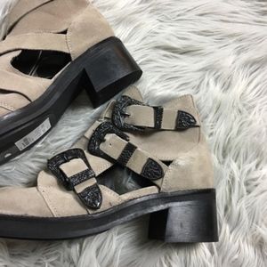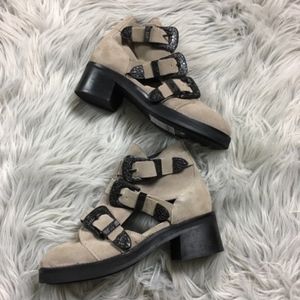 Embossed hardware lends a touch of vintage Western style to a moto-inspired bootie with breezy cutouts and a chunky block heel. Has the three buckles across for access into the shoe.