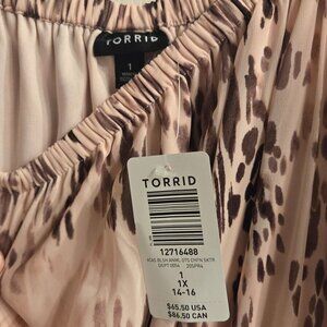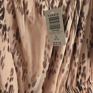 NWT Torrid Size 1X 14/16 off the shoulder dress. Pale pink dress with pink, tan, mauve, and brown animal print. Knee length, fit and flare. Elastic at waist and shoulders. Fully lined. Never worn and now it no longer fits and needs a new home.