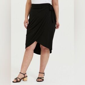 NWT Torrid Black Faux Wrap Stretchy Midi Skirt with Side Tie, Tulip Hem, Wide-Stretch Waistband, Unlined, with Wrinkle-Resistant Studio Knit Fabric.