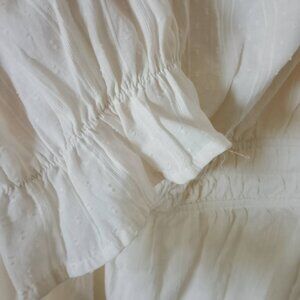 Features: elastic square neck, blouson long sleeves, smocked waist, pull over styling, 100% cotton woven fabric