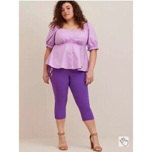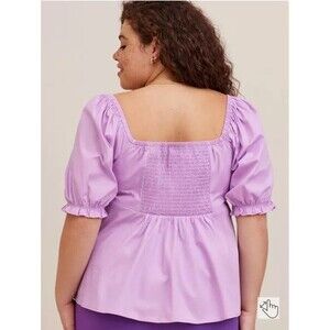 This Torrid Disney Tangled Rapunzel Peplum Top in size 3XL is a must-have for any fan of the beloved movie. The top features a sweetheart neckline and short puff sleeves, with a pullover closure for easy wear. The purple spandex and cotton material is lightweight and stretchy, making it perfect for travel, parties, or casual wear.