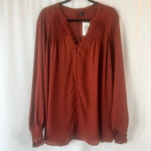 Elevate your wardrobe with this elegant rust blouse. Featuring a button-down front and delicate detailing, it's perfect for any occasion.